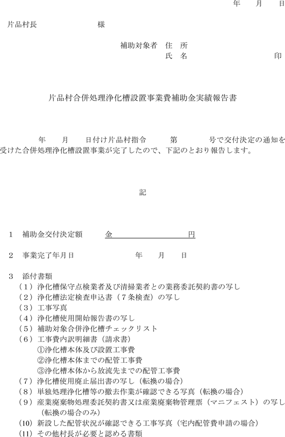 第8条 補助対象者は、補助事業完了後速やかに実績報告書(様式第4号)に次の書類を添付して村長に提出しなければならない。