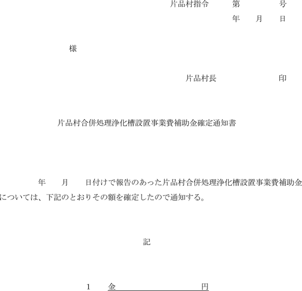 第1条 村長は、生活排水による公共用水域の水質汚濁を防止するため、合併処理浄化槽の設置に要する経費について、予算の範囲内において補助金を交付するものとし、当該補助金の交付に関しては、片品村補助金等に関する規則(昭和41年規則第3号)に定めるもののほか、この要綱の定めるところによる。