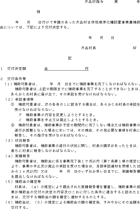 第9条 村長は、前条の規定により事業実績報告書の提出があったときは、当該報告書の審査及び現地検査によりその報告に係る補助事業の成果が、補助金の交付決定内容及びこれに付した条件に適合するとみとめるときは補助金の交付を確定し、補助金交付決定通知書(様式第5号)により補助対象者へ通知する。
