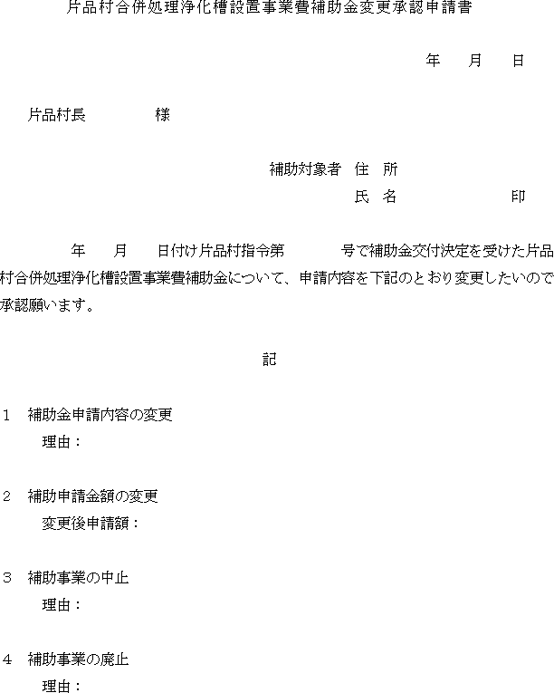 第7条 前条の規定により補助金交付決定通知書を受けた者(以下「補助対象者」という。)は前条の補助金交付決定通知を受けたのち、補助金申請内容を変更する場合又は補助事業を中止若しくは廃止しようとするときは、変更承認申請書(様式第3号)を村長に提出し、その承認をうけなければならない。