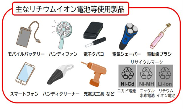 そのため、燃えるごみ・燃えないごみ等では出せなく、家電量販店などの回収協力店へ持ち込んでいただくよう周知しておりましたが、収集作業員の安全確保や事故の未然防止のため、家庭で使用したリチウムイオン電池やモバイルバッテリーなどの小型充電式電池及びそれらが内蔵された小型家電製品の回収を行います。